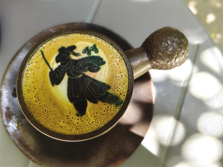 驚喜還有很多,就像店內(nèi)柜體上的一句話“可以讓大家體會到我們不一樣的用心”,這些年輕人用心起來還真能撬動地球。飲品和咖啡,設計團隊愣是把口味和地域文化結合起來,整出了幾款“限量版”:城市限定——沙橙暴飲品,西北特有;特調(diào)咖啡——苦水玫瑰特調(diào),讓人一口難忘之余還配上了臺詞,“苦水玫瑰有點甜”;“文物咖啡”更是占據(jù)“C位”,咖啡拉花機“印制”而成的微縮版銅奔馬、蛙紋罐、銅車馬等文物圖案浮在濃郁的咖啡上,精致、唯美。這還不算,咖啡器皿的名稱也非同尋常——鷹首權杖杯。陶瓷來自景德鎮(zhèn),手柄是省博鷹頭形青銅權杖首的文物原型。驚嘆、贊美、感慨,每一位品嘗之人喜愛之余竟不忍飲用。