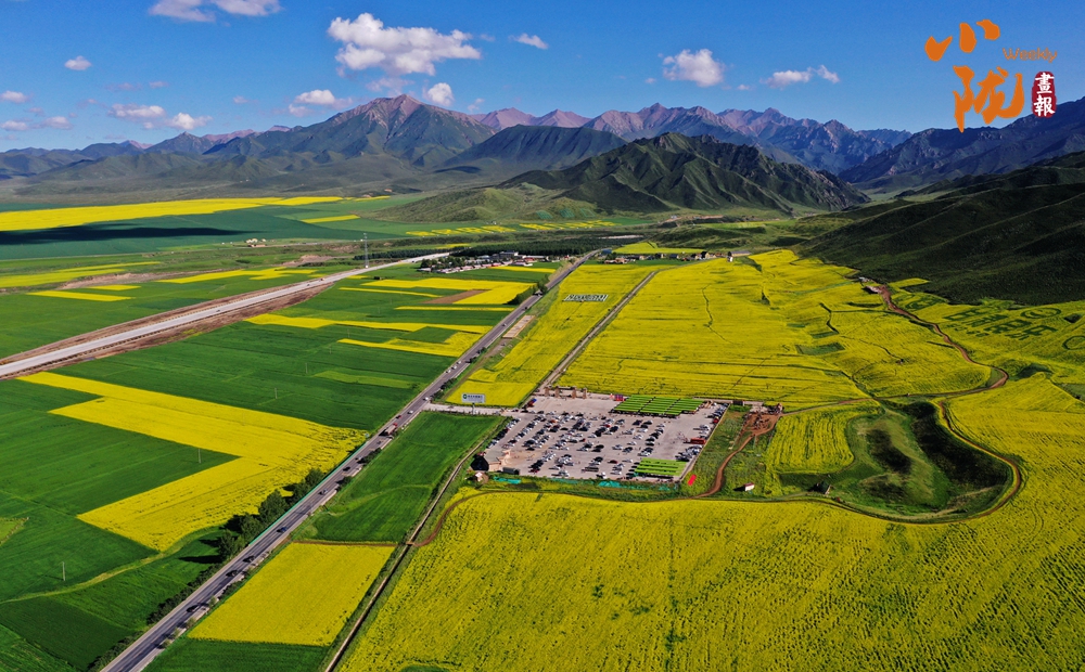 在藍(lán)天白云和祁連雪峰的映襯下,那盛開(kāi)的油菜花、點(diǎn)綴在花海中的村莊人家,勾勒出一幅優(yōu)美的田園風(fēng)光畫(huà)卷。