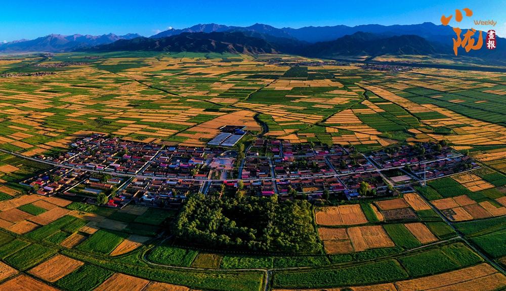 廣袤無(wú)邊的田野生機(jī)盎然,金黃色的油菜花夾雜著一塊塊碧綠色的麥田,好像給大地鋪上了一層五顏六色的大地毯。漂亮的民居鑲嵌其中,與祁連山相互輝映,在陽(yáng)光下美麗極了!
