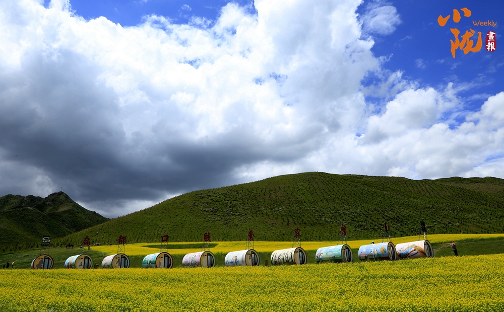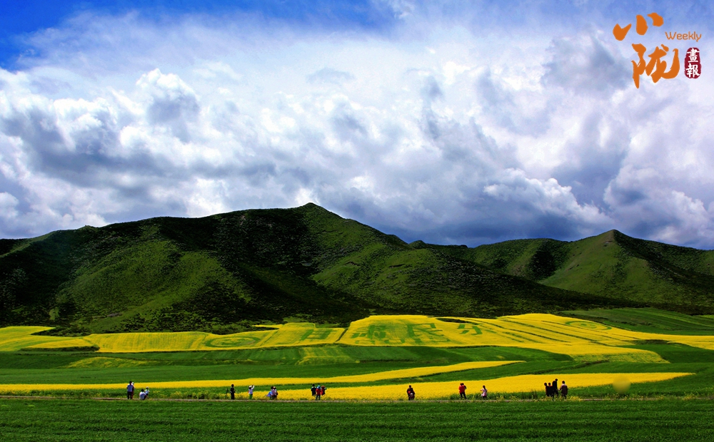 遠(yuǎn)處,山巒高低起伏;近處,黃綠相間。金黃的油菜花和藍(lán)天、雪山、白云融合在一起,組成了別致的夏日美景,充滿(mǎn)了西部特有的浪漫色彩。