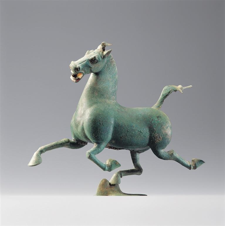 銅奔馬,東漢,1969年武威市雷臺墓出土。馬作奔騰狀,三足騰空,右后蹄踏一展翅飛翔、回首驚顧的飛鳥。奔馬全身著力點集于超掠飛鳥的一足之上,準確地把握了力學平衡。蹄踏飛鳥,表現(xiàn)出馬行迅疾,在鳥驚回首的剎那已經(jīng)超越了飛行的鳥。銅奔馬鑄造精美,構思巧妙,為我國青銅藝術中罕見的杰作,1983年被確定為中國旅游標志,2002年被國家文物局列入首批禁止出國(境)展覽文物目錄。它以卓絕的藝術造詣千古生輝,成為中華民族勇往直前、積極進取偉大氣質(zhì)的象征。