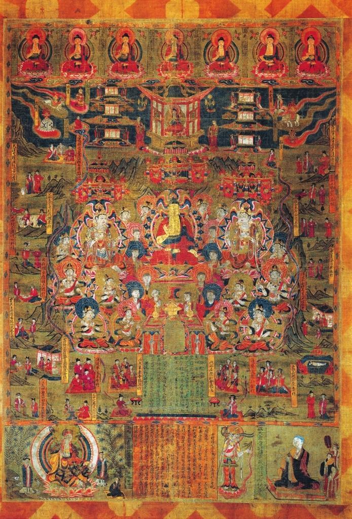 該畫為絹地設色,出自敦煌莫高窟藏經(jīng)洞。畫面中心為說法圖,一佛二菩薩法相莊嚴,諸菩薩、弟子、比丘、比丘尼、優(yōu)婆塞、優(yōu)婆夷等“赴會圣眾”圍繞周圍。兩側及上方分布15幅經(jīng)變故事圖,以連環(huán)畫形式鋪陳展現(xiàn)《佛說父母恩重經(jīng)》的基本內(nèi)容。其上繪七佛、彌勒與七寶,其下墨書《佛說報父母恩重經(jīng)變》。絹畫最下方自左向右排布地藏菩薩、《繪佛邈真紀》、引路菩薩及比丘尼戒行邈真像。該絹畫保存完整,色彩絢麗,是敦煌《佛說父母恩重經(jīng)》諸變相中,內(nèi)容最復雜,畫面情節(jié)最多,特點最鮮明,風格最獨特的一幅,且有宋淳化二年(公元991年)明確紀年,具有重要的歷史、藝術和研究價值。