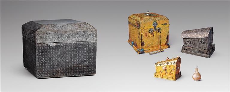 大云寺五重舍利寶函,涇川縣大云寺出土。最外層的石函由質(zhì)地堅硬的灰色大理石制成,四壁陰刻《涇州大云寺舍利石函銘并序言》,并有參與舍利發(fā)現(xiàn)和奉安儀式的職官、僧眾題名,共千余字,紀年為“延載元年”(公元694年)。其內(nèi)層層套置鎏金銅匣、銀槨、金棺和玻璃舍利瓶,舍利瓶內(nèi)裝舍利14粒,形如米粒。這套舍利容器精巧華麗,光彩奪目,反映了盛唐時期金銀細工的最高技藝。這套舍利容器是考古發(fā)現(xiàn)最早的以中國傳統(tǒng)棺槨制度設計舍利容器,并置于地宮之中實例,是佛教文化與中國本土習俗相融合的重要實物見證。