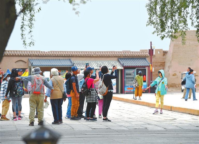 游客在嘉峪關(guān)關(guān)城拍照留念。新甘肅·甘肅日?qǐng)?bào)記者 馬伊星
