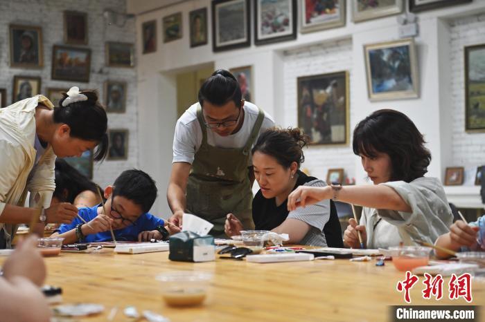 8月20日,甘肅敦煌莫高里工匠村內(nèi),學員體驗敦煌文化研學課程。工匠村開設(shè)了泥板畫、彩繪、雕塑制作、剪紙、農(nóng)耕體驗等課程,現(xiàn)已發(fā)展成為一個集敦煌文化講堂、壁畫書法研習、美術(shù)設(shè)計、彩塑制作教學、篆刻藝術(shù)、傳統(tǒng)釀酒體驗、農(nóng)業(yè)產(chǎn)業(yè)發(fā)展等于一體的多功能實訓基地。中新社記者 李亞龍 攝