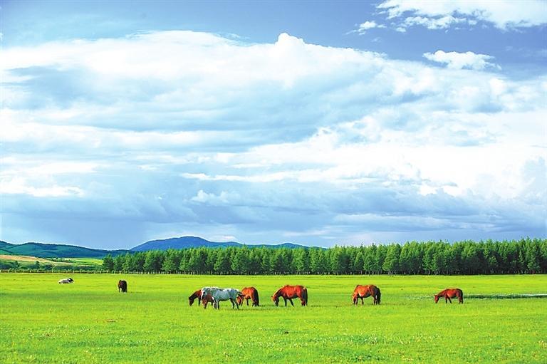 置身草原,高遠(yuǎn)空曠的天空下面,是明凈遼闊的草場(chǎng),白色的羊和黑色的牛像灑落在草叢中的白珍珠和黑珍珠,一頂頂帳篷點(diǎn)綴其間,不遠(yuǎn)處,有游人騎在馬背上,優(yōu)哉游哉,或拍照或奔馳。這里一年四季景色都十分迷人:春天山花爛漫,姹紫嫣紅,如煙如夢(mèng);夏季綠草如茵,碧波浪涌,養(yǎng)心養(yǎng)眼;秋天云纏霧繞,層林盡染,美麗迷人;冬天銀裝素裹,瓊花玉樹,一派北國風(fēng)光。