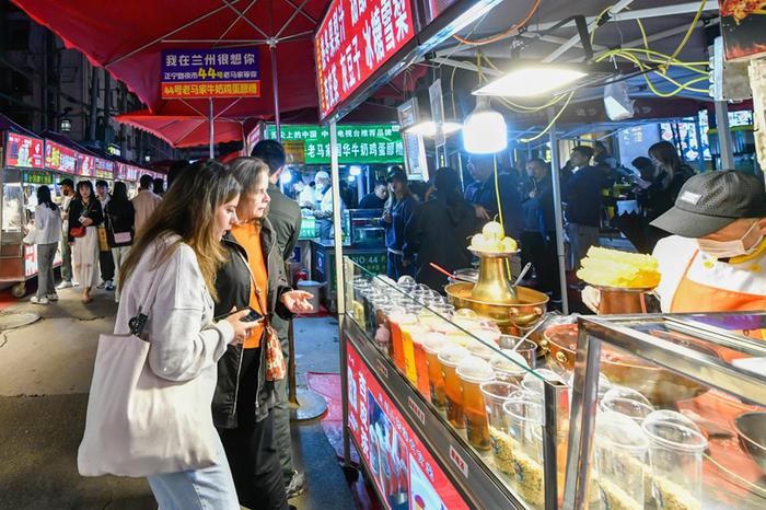 游客在蘭州市城關(guān)區(qū)正寧路小吃夜市選購特色美食。新華社記者 郎兵兵 攝