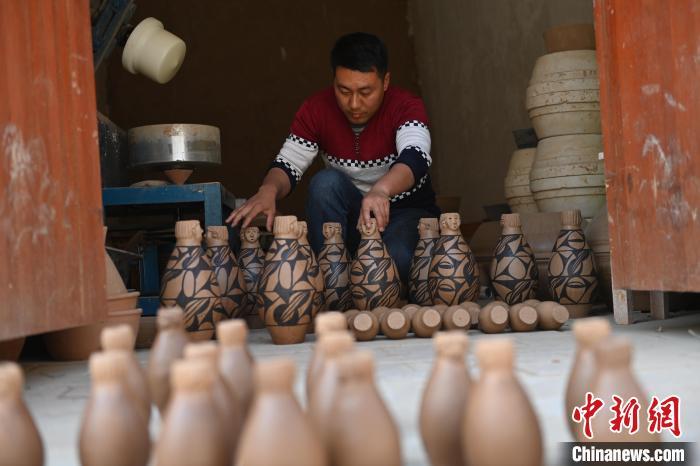 4月11日,甘肅省天水市秦安縣康坡村陶藝車間內,甘肅省級非物質文化遺產名錄秦安陶器燒制技藝天水市級傳承人康曉龍趕制大地灣文創(chuàng)彩陶。李亞龍 攝