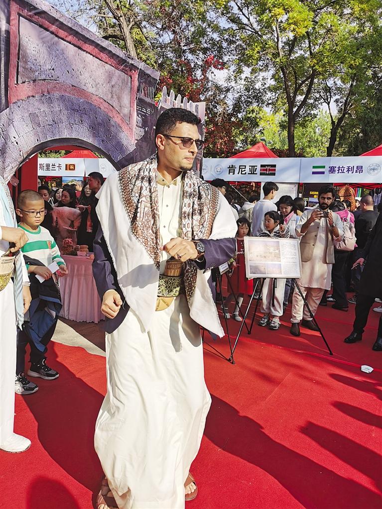 當(dāng)日下午,記者來到現(xiàn)場看到,中國、馬達加斯加、蘇丹、俄羅斯、德國、也門、斯里蘭卡、印度……各國展臺前人們摩肩擦踵,空氣中彌漫著美食的味道與火熱的激情。身著各國傳統(tǒng)服飾的人群中,滿目都是俊男靚女,讓人恍若置身國際大都會。
