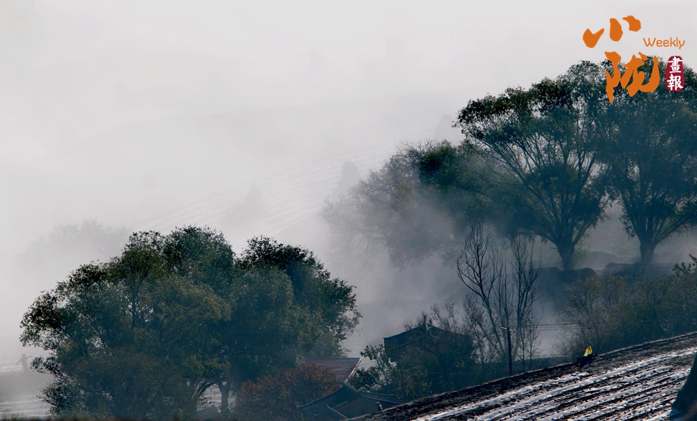 霧氣彌漫,大樹如墨,好一幅中國山水意境圖。