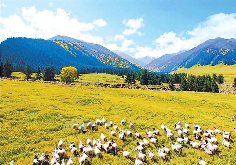 走進(jìn)景區(qū),映入眼簾的便是布爾智峽谷,其重巒疊嶂,造型奇特。進(jìn)入峽谷,豁然中開,地勢(shì)平坦,視野開闊,形成五山匯集的盆地景觀,一條悠悠的小河穿過(guò)盆地的胸膛,明亮清澈。遠(yuǎn)山白雪皚皚,山腰云杉參天,山下灌木叢生,蒼翠蔥郁,山底蒼蒼茫茫的草原上,不時(shí)涌動(dòng)著潔白的羊群。徜徉于廣袤的草原,便真正體味到“鳥的世界,花的海洋”的博大內(nèi)涵。