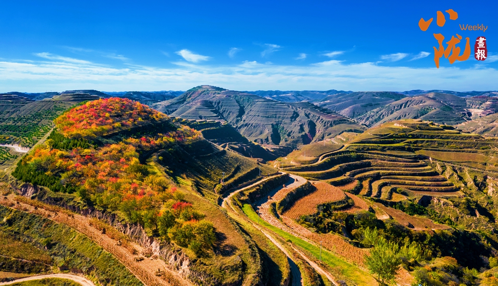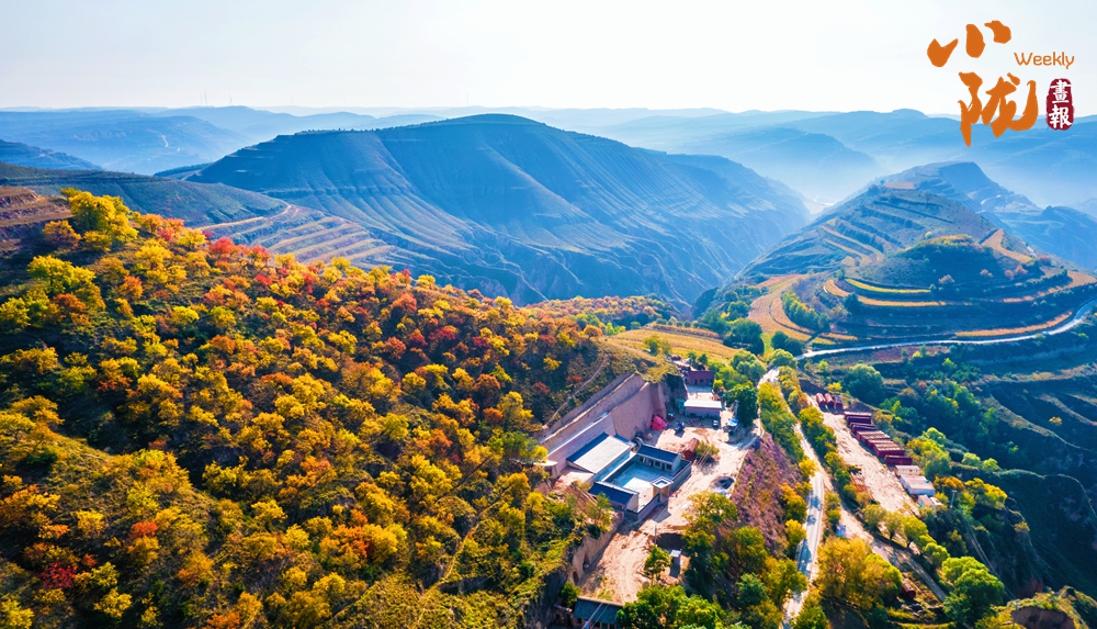 放眼望去,層林盡染,秋色與藍天白云相互映襯,把這里的溝壑梁峁裝點的五彩斑斕。