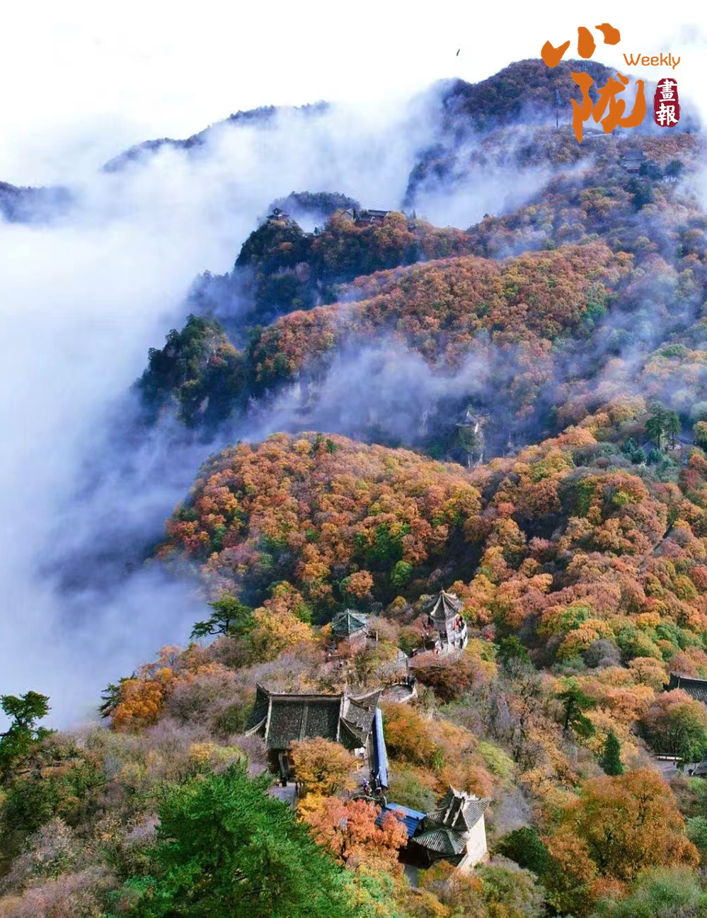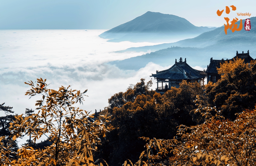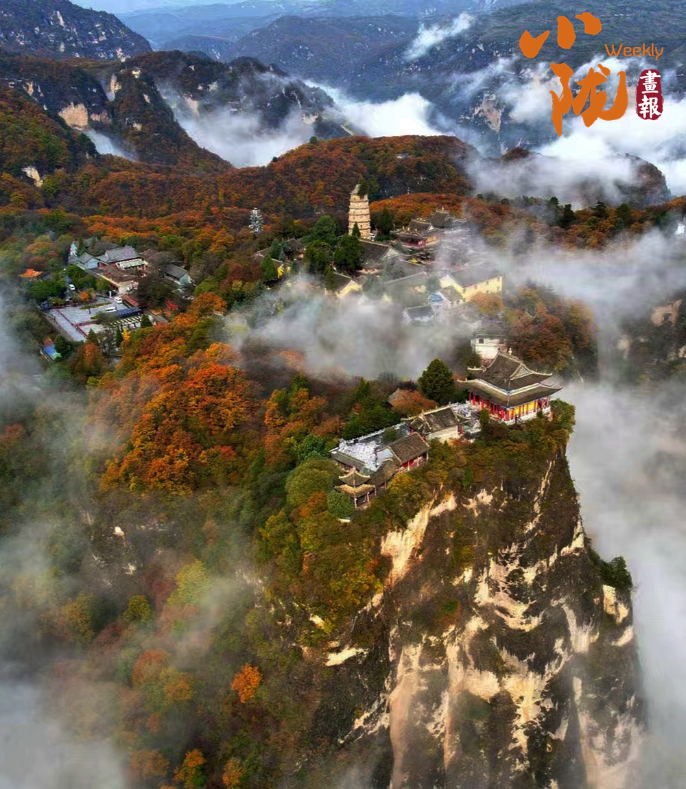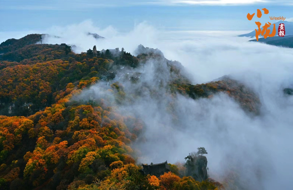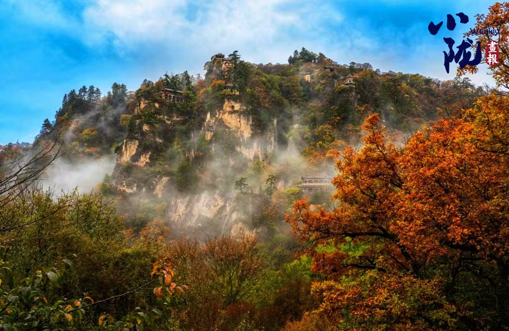 一葉知冬,遍地金黃。五彩斑斕的林木與古香古色的建筑、遠處的山巒云霧相映成趣,盡顯詩意之美。