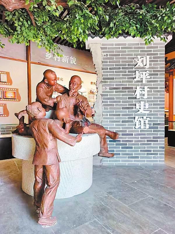 年復(fù)一年的寒來(lái)暑往中,大榆樹(shù),也就成了劉坪村的望鄉(xiāng)臺(tái)。每個(gè)村莊,都有它的望鄉(xiāng)臺(tái),它承載著人們共同的記憶,是人們重溫鄉(xiāng)愁的地標(biāo),永遠(yuǎn)鐫刻在人們的心底。2000年,電視劇《黃沙下面是沃土》的劇組來(lái)到劉坪村拍攝取景,村里的望鄉(xiāng)臺(tái)大榆樹(shù)被拍進(jìn)電視劇畫(huà)面。在劉坪村村史館布設(shè)中,專(zhuān)家和學(xué)者數(shù)易村史館方案,最終確定在村史館正門(mén)之內(nèi)塑造一組雕塑,意思是由一位老人講述劉坪村的村史,作為村史館的題眼,村史館內(nèi)還陳列了《劉坪村志》,分為建置、地理、村落文化、風(fēng)土人情等14卷,共40萬(wàn)字。館內(nèi)能播放劉坪村村史專(zhuān)題片《耕讀傳家》。