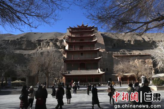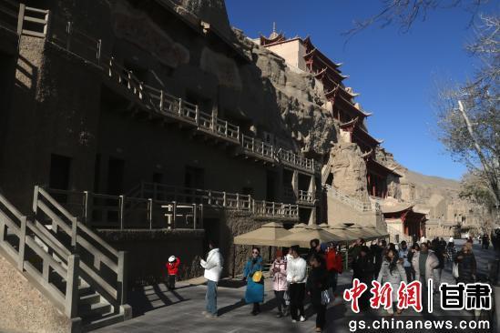 初冬時(shí)節(jié),游客走進(jìn)世界文化遺產(chǎn)甘肅敦煌莫高窟欣賞燦爛的石窟藝術(shù),品味悠久的敦煌歷史文化。
