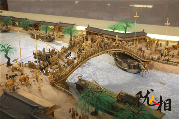 劉金祿歷時(shí)25年創(chuàng)作的白牦牛角微雕版《清明上河圖》,長16米,寬1.6米,共微雕人物1460名,動物300余頭、房間400余間、大小船只30余艘、牛馬車輛50余輛。小到杯盞酒蝶,大到雕梁畫棟,都有生動刻畫,徹底將《清明上河圖》由平面畫作搬上了立體展臺。