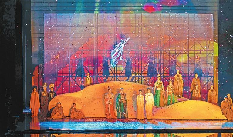 大型原創(chuàng)音樂劇《飛天》以“大愛”立意敘事,打破時空界限,利用現(xiàn)代舞美技術,多維度、多角度、多層次地展現(xiàn)了敦煌石窟的無窮魅力,令觀眾身臨其境、沉浸其中,情感共鳴油然而生,獲得獨特的藝術體驗。(本文配圖均為《飛天》劇照,由蘭州大劇院提供)
