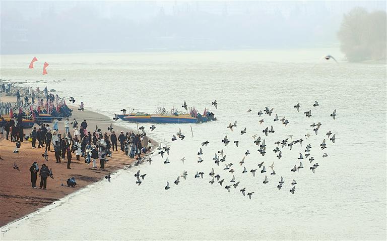 冬日的黃河蘭州段,鴿群飛翔,游人在黃河岸邊盡享愜意時光。新甘肅·甘肅日報記者 周尚業(yè)