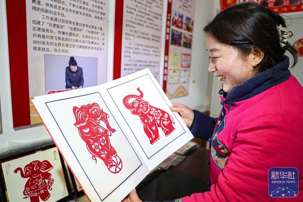 1月4日,在慶陽市合水縣西華池鎮(zhèn)唐旗村,張雪峰展示黃河古象主題剪紙作品。