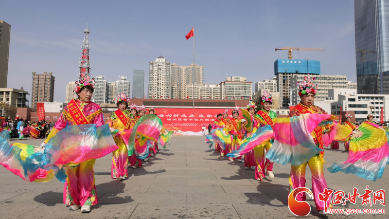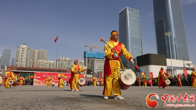 隨著開(kāi)場(chǎng)鑼鼓響起,廣場(chǎng)瞬間被喜慶氛圍包圍。大鼓與舞獅表演率先登場(chǎng),雄渾的鼓聲與靈動(dòng)的舞獅相得益彰,贏得觀眾陣陣喝彩。隨后,《妹妹的山丹花》以?xún)?yōu)美的旋律和歡快的舞姿,生動(dòng)展現(xiàn)了西北地區(qū)的獨(dú)特風(fēng)情。