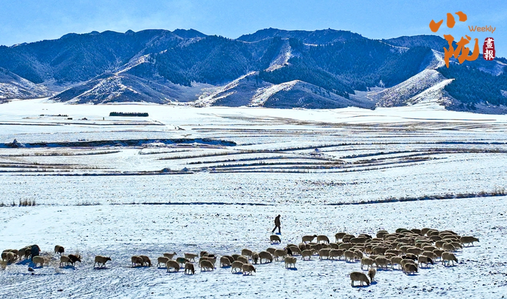 山腳下的牧民人家炊煙裊裊升起,與雪地、羊群、藍(lán)天構(gòu)成了一幅和諧共生的春日畫卷。