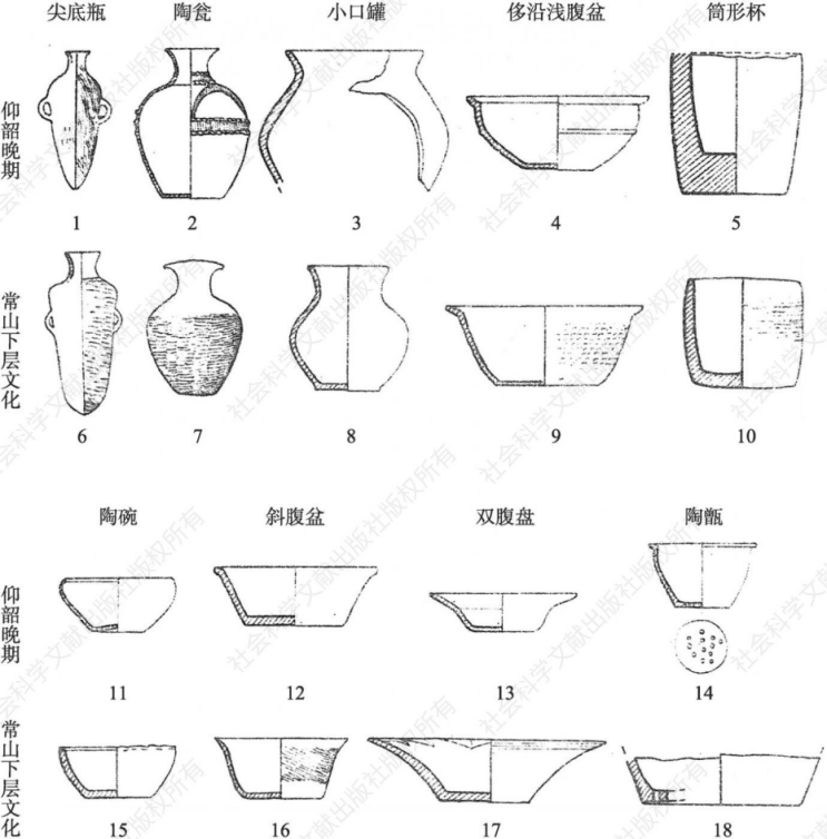 常山下層文化遺存雖發(fā)現(xiàn)較早,但長期被誤認(rèn)作齊家文化或客省莊二期文化。1979年秋,隨著常山遺址發(fā)掘工作的推進(jìn),發(fā)現(xiàn)它與齊家文化聯(lián)系緊密,與客省莊第二期文化、廟底溝二期文化有相同或相似之處,可是,它們各自文化性質(zhì)是不相同的。胡謙盈先生認(rèn)為分布在寧夏南部和隴山東西兩側(cè),涇渭兩河等地區(qū)命名的齊家文化其實是屬于客省莊二期文化和常山下層文化遺存。經(jīng)碳14測定,常山下層文化年代約為公元前2930±180年(樹輪校正年代),廟底溝二期文化(約公元前2700 - 前2400年),陜西客省莊第二期文化(約公元前2400 -前2000年),甘肅齊家文化(約公元前2200 - 前1600年),常山下層文化比后兩者原始文化分別早七、八百年。為將常山遺址作為獨特文化典型深入研究,避免名稱限制對其與其他文化關(guān)系的探討,胡謙盈先生提出“常山下層文化”這一命名,以區(qū)別于“齊家文化”或“客省莊第二期文化”,并認(rèn)為它是齊家文化的重要源頭之一。