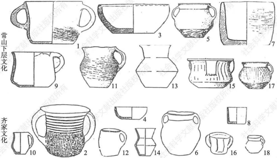 常山下層文化過去限于資料太少,對其研究進(jìn)展緩慢,近年來很多學(xué)者研究有了新的突破。陶器在常山下層文化中獨具特色,橙黃色、紅褐色陶器搭配斜行籃紋,成為其顯著特征。諸多齊家文化器物,如豎行籃紋單耳罐、單耳杯、雙耳杯、侈口罐等,皆可在常山下層文化中尋得淵源,胡謙盈據(jù)此提出“常山下層文化是齊家文化的重要來源”,張忠培亦認(rèn)為,常山下層文化的提出,有力推動了齊家文化淵源的研究。不過,學(xué)界對于齊家文化的起源尚存爭議,有人認(rèn)為齊家文化是馬廠類型的的延續(xù)與發(fā)展,也有人認(rèn)為是獨立發(fā)展而成,還有人認(rèn)為是馬家窯文化發(fā)展到馬廠類型后分東西兩支,一支發(fā)展為河西的四壩文化,一支發(fā)展為齊家文化。韓建業(yè)先生認(rèn)為齊家文化應(yīng)當(dāng)是客省莊二期文化西進(jìn)隴東南并與菜園文化融合的結(jié)果,齊家文化早期的絕對年代約在公元前 2400-前 2200 年,這個時段在中國內(nèi)地屬于銅石并用時代晚期,分布在天水一帶的遺存是齊家文化早期階段,常山下層文化絕對年代約在公元前2700-前2400年,相當(dāng)于廟底溝二期階段,再向下就屬于齊家文化早期階段。 近年來,大多學(xué)者提出齊家文化源頭大致在隴東及寧夏南部,由東向西漸進(jìn)擴(kuò)展。