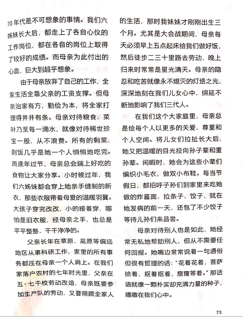 由于母親放棄了自己的工作,全家生活全靠父親的工資支撐。但母親治家有方,勤儉為本,將全家打理得井井有條。母親對(duì)待糧食、菜葉乃至每一滴水,就像對(duì)待稀世珍寶一般,從不浪費(fèi)。所有的剩菜、剩飯幾乎是她一個(gè)人悄悄地吃完。而逢年過(guò)節(jié),母親總會(huì)端上好吃的食物讓大家分享。小時(shí)候過(guò)年,我們六姊妹都會(huì)穿上她親手縫制的新衣,那些衣服帶著母愛(ài)的溫暖羽翼。大孩子穿完改改,小的接著穿,哪怕是舊衣服,經(jīng)母親之手,也總是平平整整、干干凈凈的。