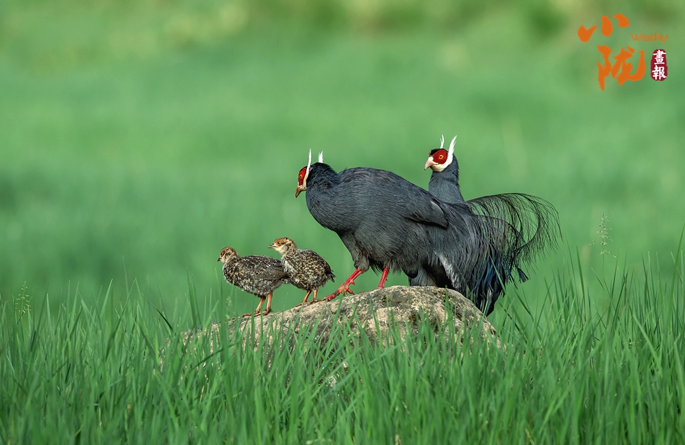 珍貴稀有的國家二級重點保護動物藍馬雞,體型較大,通體藍灰色,頸項和肩部顏色更深,閃爍著金屬般的輝亮。其尾羽特別長,由灰藍色漸變?yōu)榘底纤{色,并渲染著金屬綠和金屬紫藍色,24枚尾羽中,中央一對尾羽特別長,富有彈性,彎曲成一個美麗的弧形,高高地翹在其他尾羽之上,披散下垂如馬尾,因而得名。此外,藍馬雞的頭側(cè)緋紅,耳羽簇白色并突出于頸部頂上,為其增添了獨特的魅力。