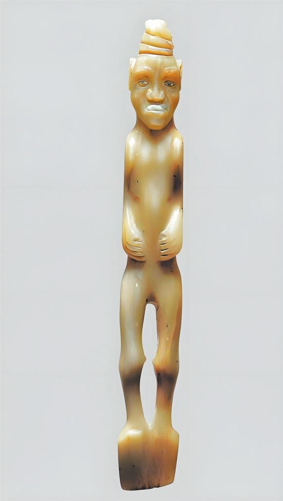 玉人形鏟高17.6厘米,1967年靈臺縣白草坡M1出土。圓雕工藝,人物裸體站像。發(fā)辮虎首蛇身盤成堆髻。長臉,闊鼻,深眼窩,大耳,厚唇前突,兩手捧腹,兩腿間呈“8”形鏤空,雙足并攏作鏟形。
