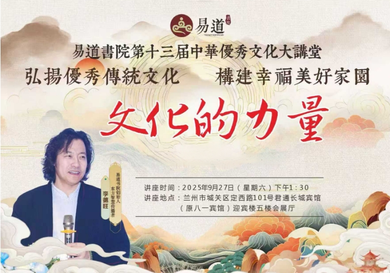響應(yīng)時代號召,弘揚傳統(tǒng)文化,旨在文化賦能行業(yè)發(fā)展,易道書院第十三屆中華優(yōu)秀文化大講堂將于9月27日在蘭州君通長城賓館(原八一賓館)迎賓樓五樓會展廳開講,誠邀有志之士共襄盛舉,學(xué)習(xí)傳統(tǒng)文化,賦能行業(yè)文明,構(gòu)建美好家園!