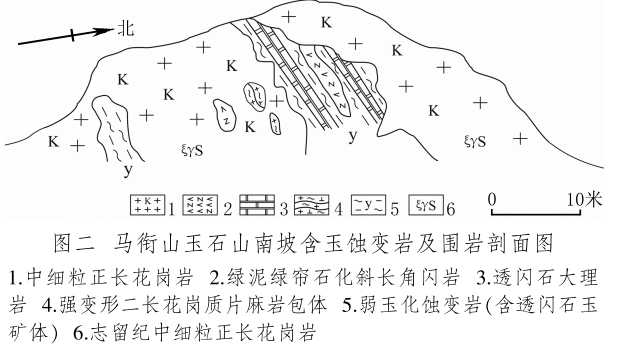 馬銜山玉礦分布在馬銜山東南部的玉石山(圖版一),海拔3028米。山上出露的地質(zhì)體主要為古元古界馬銜山巖群、中元古代片麻二長(zhǎng)花崗質(zhì)巖[3]和志留紀(jì)正長(zhǎng)花崗巖及正長(zhǎng)巖。馬銜山巖群的巖性為黑云斜長(zhǎng)片麻巖、變粒巖、斜長(zhǎng)角閃巖和白云質(zhì)大理巖,巖石普遍遭受了韌性變形,變余糜稜?zhēng)r發(fā)育。志留紀(jì)巖漿侵入期后熱液活動(dòng)較強(qiáng),石英脈細(xì)脈發(fā)育,局部見螢石礦化或礦床[4]。玉礦化主要產(chǎn)于馬銜山巖群與志留紀(jì)正長(zhǎng)花崗巖和正長(zhǎng)巖接觸帶上(圖版二),具體賦存在與白云質(zhì)大理巖的接觸部位,是正長(zhǎng)花崗巖及正長(zhǎng)巖與鎂質(zhì)大理巖接觸交代蝕變的產(chǎn)物[5]?;◢弾r與片麻巖、變粒巖和斜長(zhǎng)角閃巖接觸界線附近巖石雖有蝕變,但不見玉化蝕變巖或玉石出露。在近山頂開采玉石揭露的一個(gè)地質(zhì)剖面清晰地顯示了這些特征(圖二)。該剖面大致呈東西走向,長(zhǎng)約50米,馬銜山巖群多呈殘留體出露,斜長(zhǎng)角閃巖綠泥綠簾石化強(qiáng)烈,大理巖普遍發(fā)生蝕變,形成透輝透閃石大理巖,緊靠花崗巖接觸地帶發(fā)育窄窄的透閃石玉礦帶。現(xiàn)在人們找玉,也主要在該剖面上的花崗巖和鎂質(zhì)大理巖的接觸帶上鑿洞,在接觸帶上見有多處采挖玉石的洞穴。在該剖面西側(cè)約50米,發(fā)育有正長(zhǎng)巖與大理巖的混染帶,肉紅色正長(zhǎng)巖中包裹混染著大量灰綠色透閃透輝大理巖,部分已蝕變?yōu)橥搁W透輝石巖,且質(zhì)地較細(xì)膩,成為半玉化巖石。剖面和周圍地質(zhì)特征表明,玉礦的形成是早古生代志留紀(jì)花崗質(zhì)雜巖體侵入到古元古代鎂質(zhì)大理巖,發(fā)生接觸交代蝕變作用的結(jié)果,在兩種巖石接觸帶形成玉礦體。但并不是蝕變帶中的巖石都是透閃石玉石,透閃石玉在蝕變帶中多呈雞窩狀或不規(guī)則狀分布,少量呈脈狀出露。從剖面及部分采坑的規(guī)模來看,玉礦體向深處有變大、變好的趨勢(shì),這主要受控于接觸面產(chǎn)狀,在傾角較緩處礦體相對(duì)較大。橫向上在背離接觸面方向圍巖具有從透閃石玉到透閃透輝石玉、透閃透輝石大理巖再到含透閃石大理巖的變化特征,反映了交代蝕變強(qiáng)度與接觸帶溫度及熱液成分變化的密切關(guān)系。從玉礦體到蝕變圍巖由于成分和結(jié)構(gòu)的變化出現(xiàn)一系列不同類型的玉石或巖石。我們?cè)谄拭嫔喜杉揭恍┬K的淡綠色玉料(圖版三)和出露較寬的微晶大理巖,經(jīng)偏光顯微鏡下薄片鑒定和XRF檢測(cè),確定有透閃石玉、透輝透閃玉、透閃透輝石玉、透閃透輝石大理巖和含透閃石大理巖等,這與馬家窯遺址出土的齊家文化時(shí)期大部分玉質(zhì)品玉料類型基本一致[6]。部分地段近礦圍巖還有透輝石巖、透輝矽卡巖、矽卡巖化大理巖、蛇紋石化大理巖、斜長(zhǎng)透輝石巖等。玉石山的采洞(坑)由于資源與環(huán)境保護(hù)的要求,大多已被填埋,但仍可見采坑殘留的位置。采洞(坑)均位于大理巖與正長(zhǎng)花崗巖接觸帶靠近大理巖一側(cè),這也間接顯示了玉礦體的位置。此外,玉石山花崗巖中石英細(xì)脈較發(fā)育,局部可見螢石礦化,反映了花崗巖侵入期后低溫?zé)嵋夯顒?dòng)仍較強(qiáng),對(duì)玉礦也有一定的改造影響。
