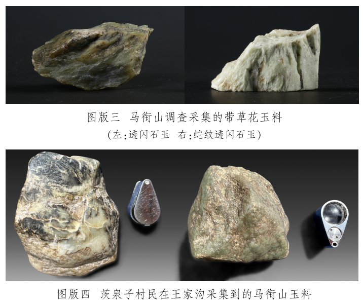 馬家窯遺址出土的齊家文化時(shí)期大部分玉質(zhì)品從外觀、礦物組成和微量元素特征上都與馬銜山玉料有極高的相似性,再加上馬家窯遺址距玉石山僅約60千米,是目前考古發(fā)現(xiàn)距離馬家窯遺址最近的玉礦山,因此馬家窯遺址出土的大部分玉質(zhì)品的原料來自馬銜山的可能性很大[28]。但從馬家窯遺址出土的部分玉邊角料所帶玉皮且都有一定的磨圓(圖版一〇)情況來看,馬家窯遺址出土的玉質(zhì)品玉料中可能有山流水或籽料。