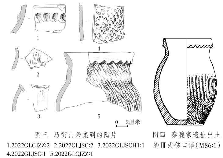 陶片 2片,2022GLCJZZ∶1,罐殘片,夾砂紅陶,腹部以下缺失。侈口,上有煙熏痕跡。短頸,頸上部有一圈鋸齒狀凸飾,鼓腹,頸部和腹部滿飾粗繩紋。復(fù)原口徑12、器壁厚0.6~1、殘高10厘米(圖三,5)。與秦魏家遺址出土的齊家文化Ⅲ式侈口罐(圖四)[16]形制相似。2022GLCJZZ∶2,罐口沿殘片,夾砂紅陶。口沿下有月牙狀附加堆紋??谘貧堥L(zhǎng)5.3、殘高4.8、厚0.7厘米(圖三,1)。