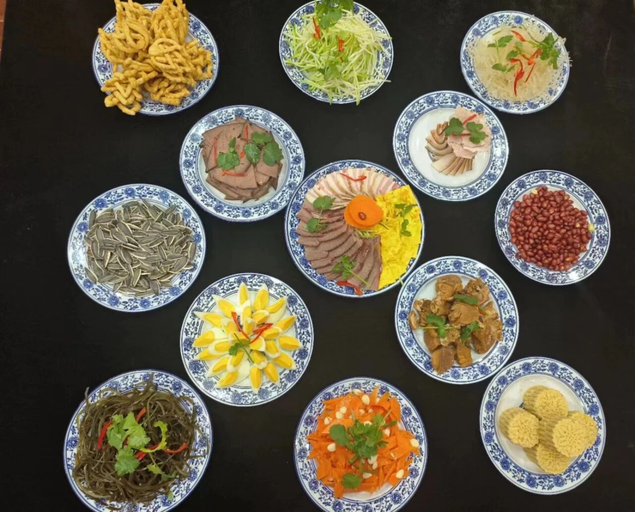 以常見的“十三花”為例,“十三花”,即十二個(gè)佐酒涼菜,加一旋菜全盤。整體具有太陽花或旋轉(zhuǎn)八卦意象,遂美稱為“花”。