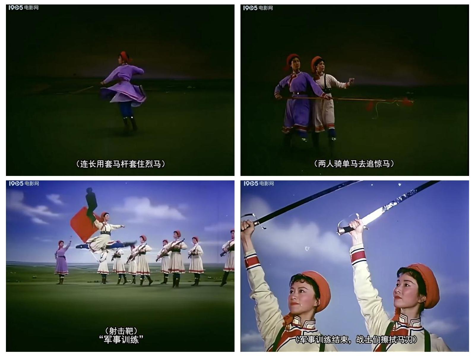《草原女民兵》最初作為舞臺(tái)舞蹈,其美學(xué)特質(zhì)建立在現(xiàn)場(chǎng)性、即時(shí)性與三維空間性之上。而當(dāng)它通過《百花爭艷》的鏡頭被重新詮釋時(shí),經(jīng)歷了一場(chǎng)深刻的美學(xué)轉(zhuǎn)換。電影不僅記錄了這一舞蹈,更通過其特有的語言系統(tǒng),對(duì)舞蹈進(jìn)行了二次創(chuàng)作與美學(xué)升華。