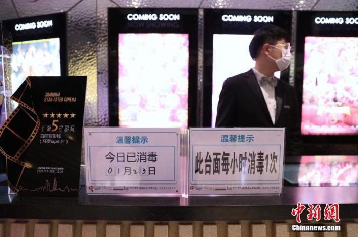 資料圖:1月23日,在上海影城、百麗宮等熱門影院前來購票觀影的人數(shù)寥寥。圖為影院在醒目位置豎起“已消毒”標(biāo)牌。中新社記者 張亨偉 攝