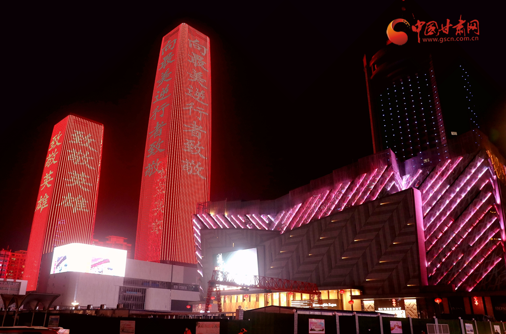 2月21日至23日,蘭州為抗疫一線英雄舉行亮燈活動(dòng)。這是2月21日鴻運(yùn)金茂樓體用燈光顯示出“向最美逆行者致敬”“致敬英雄”的文字向英雄致敬。