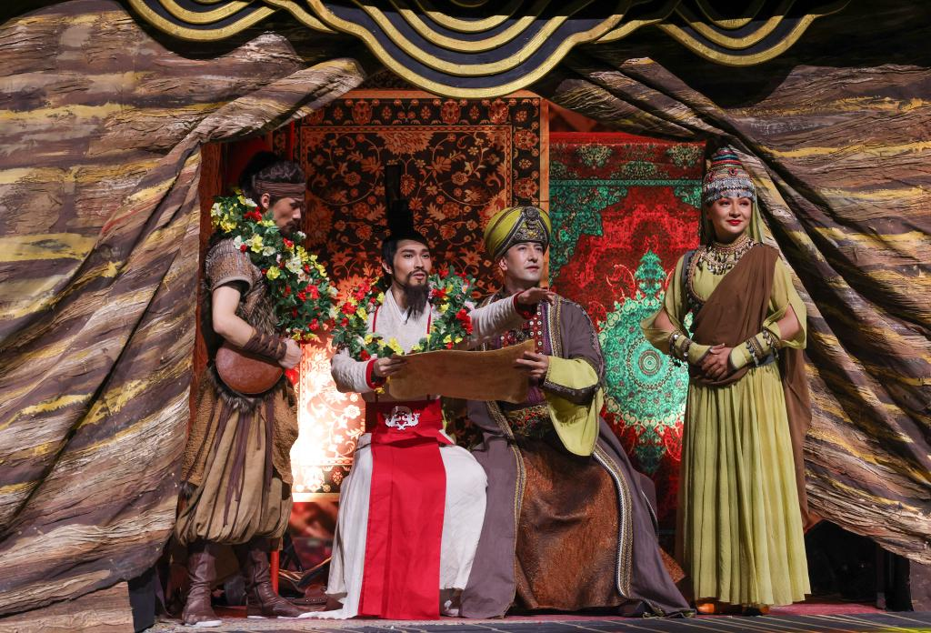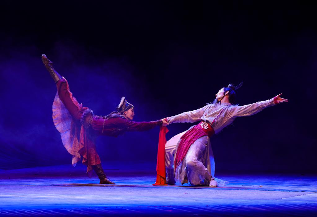 10月27日晚,在烏魯木齊文化中心大劇院,演員在舞劇《張騫》中表演。 10月27日晚,以漢代張騫出使西域?yàn)樗{(lán)本創(chuàng)作的重大歷史題材舞劇《張騫》,在烏魯木齊文化中心大劇院首演。該劇由《授節(jié)》《守節(jié)》《傳節(jié)》《使節(jié)》四幕組成,演繹了張騫出使西域的“鑿空之旅”,展現(xiàn)了各民族廣泛交往、全面交流、深度交融的生動(dòng)場(chǎng)景。 新華社記者 王菲 攝