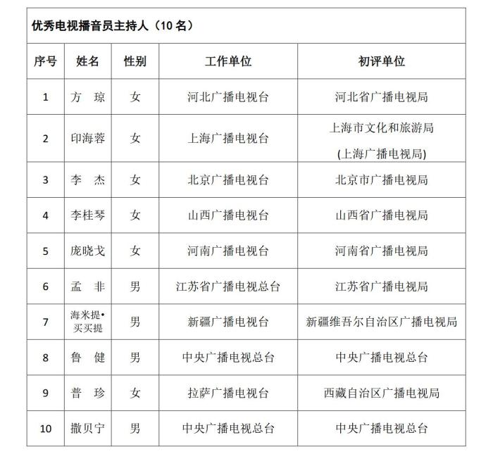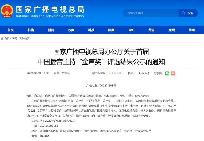 《通知》指出,根據(jù)《國家廣播電視總局辦公廳關(guān)于組織參加中國廣播電視節(jié)目獎(jiǎng)•首屆中國播音主持“金聲獎(jiǎng)”評選工作的通知》(廣電辦發(fā)〔2021〕277號(hào)),經(jīng)過初評、復(fù)評和終評,評選出優(yōu)秀廣播播音員主持人、優(yōu)秀電視播音員主持人各10名?,F(xiàn)將評選結(jié)果予以公示,公示期為5個(gè)工作日。