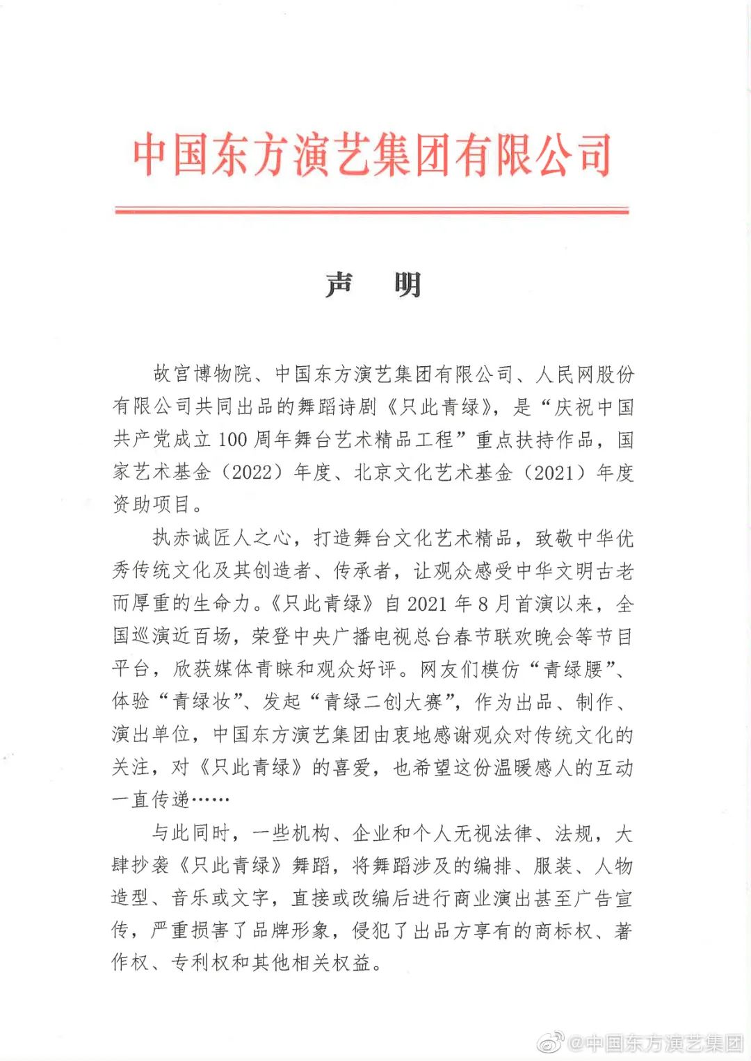 作為舞蹈詩劇《只此青綠》出品方之一,中國東方演藝集團(tuán)25日發(fā)表聲明,已啟動(dòng)對(duì)《只此青綠》的全面維權(quán)行動(dòng)。