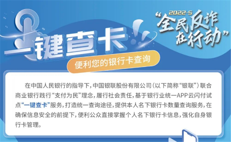 為解決群眾對于跨行銀行卡賬戶查詢的訴求,2021年12月,人民銀行指導中國銀聯股份有限公司聯合商業(yè)銀行基于銀行業(yè)統(tǒng)一APP云閃付試點“一鍵查卡”功能,打造統(tǒng)一查詢途徑,向公眾提供銀行卡數量、每張卡的銀行名稱、借貸記屬性、脫敏卡號等信息的查詢,在確保信息安全的前提下,便利公眾直接掌握個人名下銀行卡信息,強化自身銀行卡管理。