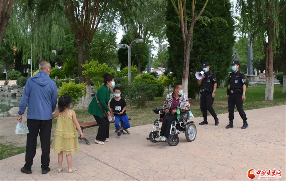 永登公安巡邏特警隊(duì)員在公園等公共場所手持小喇叭勸導(dǎo)群眾戴口罩少聚集不出門。永登縣局 徐大明/攝