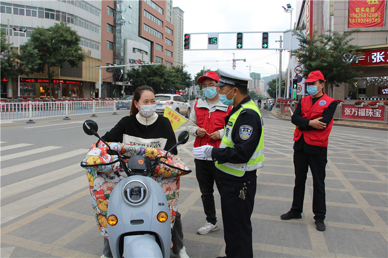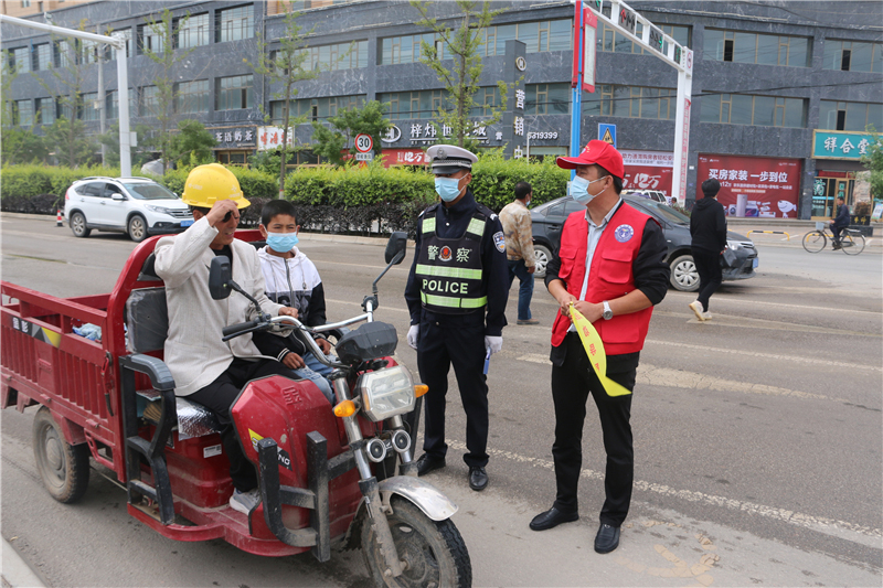9月28日上午,參加“駕駛?cè)藢W(xué)習(xí)教育體驗(yàn)”活動(dòng)的記滿(mǎn)分駕駛?cè)苏诟拭C定西岷縣小南門(mén)十字路口對(duì)不文明交通行為認(rèn)真的進(jìn)行著勸導(dǎo)。