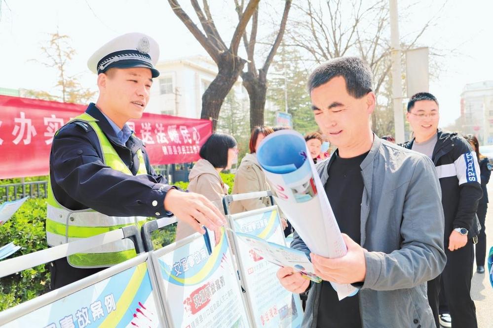 民警給過路群眾發(fā)放宣傳資料。4月8日,鎮(zhèn)原縣公安局交警大隊開展“春風(fēng)送法暖民心”主題宣傳活動。新甘肅·甘肅法治報記者馬志國攝