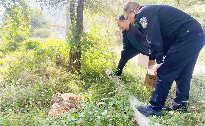 到達(dá)現(xiàn)場(chǎng)后,經(jīng)確認(rèn)該野生物種屬于國(guó)家二級(jí)保護(hù)動(dòng)物、雕鸮(貓頭鷹)。通過現(xiàn)場(chǎng)檢查,該貓頭鷹身體狀況良好,無(wú)外傷,活動(dòng)情況良好,具有野外生存能力,符合放生條件。于當(dāng)日,民警將其帶至野外放歸大自然。