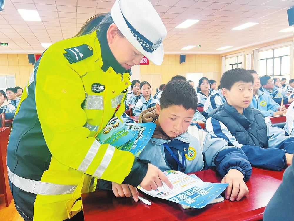 民警向?qū)W生講解交通安全知識。2月26日,臨潭縣公安局交警大隊組織民警走進臨潭縣回民中學,開展交通安全進校園宣傳活動。 新甘肅·甘肅法治報記者金凡裕攝