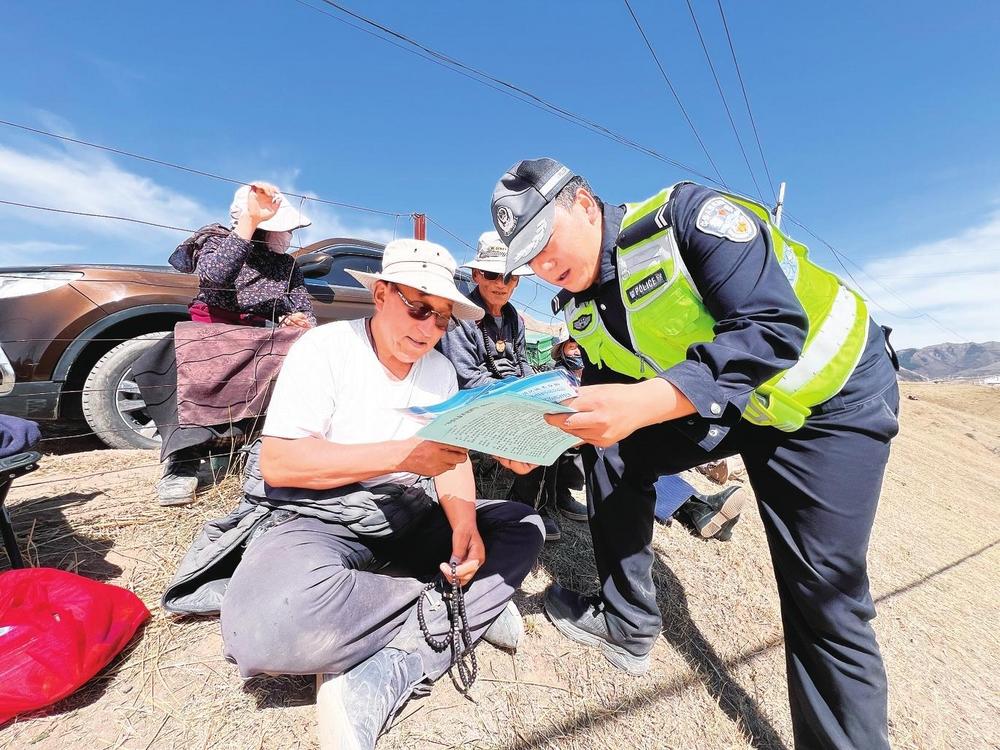 民輔警向群眾講解交通安全知識。近日,碌曲縣公安局交警大隊民輔警借助夏澤灘春季賽馬活動有利時機(jī),開展“美麗鄉(xiāng)村行”交通安全巡回宣傳活動。 新甘肅·甘肅法治報記者金凡裕攝