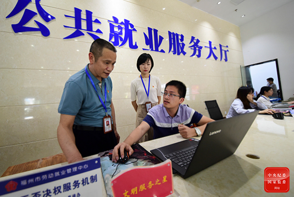 連日來,福建省福州市紀(jì)委監(jiān)委駐市委組織部紀(jì)檢監(jiān)察組深入市人社局下屬單位、有關(guān)企業(yè)調(diào)研督查“穩(wěn)崗就業(yè)”工作推進(jìn)落實情況。圖為紀(jì)檢監(jiān)察組成員在福州市公共就業(yè)服務(wù)大廳,對相關(guān)工作進(jìn)行調(diào)研監(jiān)督。李德鄰 攝