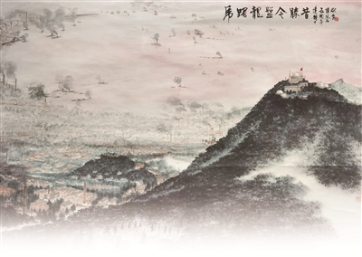 1949年4月23日,人民解放軍占領(lǐng)南京。毛澤東聞訊后,欣然寫下這首詩,描寫了人民解放軍橫渡長江、解放南京的雄偉壯闊、氣勢磅礴場面。在畫作中,畫家描繪的是南京城的壯麗景色,沐浴在朝暉之中的紫金山及其周圍景致,以浪漫的詩意呈現(xiàn)出來。近處,紫金山巍峨高聳,天文臺亦清晰可見;中景,江上輪渡往來,兩岸工廠林立,煙霧繚繞;遠(yuǎn)處,紅霞爛漫,水天一色。新中國成立后的南京繁忙而祥和,墨色淋漓間,新中國欣欣向榮的景象躍然紙上。
